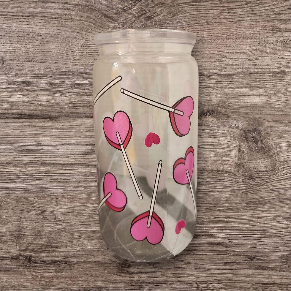 Glass or Plastic cups with reusable lids, straws, and cleaning brushes! All have their own unique design. 16 OZ - 20 OZ